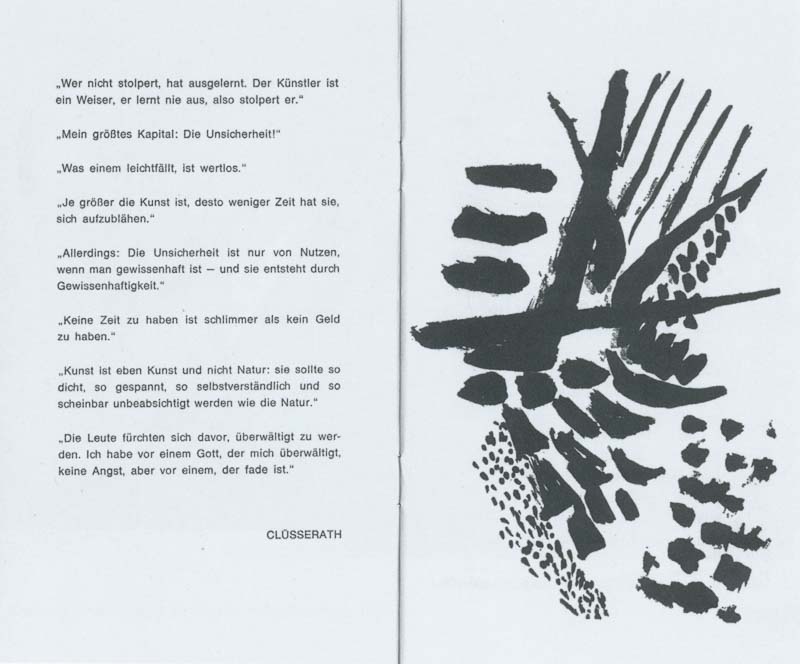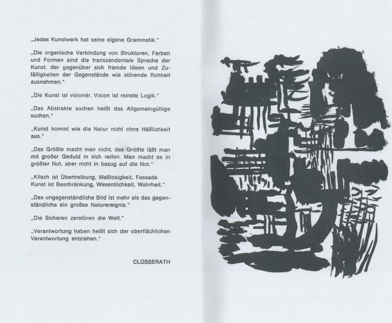 Was versteht August Clüsserath unter Kunst? „kunst ist leben, leidenschaft, gefühl, menschlichkeit, inbrunst, frömmigkeit" antwortet er 1955. „das kunstwerk ist das gefäß für ein starkes erlebnis eines tiefen charakters, und wer nur das äußerliche sieht, der wird nie sein wesentliches erkennen," „schlagworte der ,kunst’: spannung, dichte, komposition, farbe - mögen meine kollegen danach streben, ich strebe nach kunst, die nur aus höchster Iebendigkeit, aus wärme, aus innigstem zusammenleben mit der natur entstehen kann.” „jedes bild ist eine kühne tat: nicht wei| es kühn sein soll, sondern weil der künstler kühn und unvoreingenommen sein soll“, heißt es im Notizbuch 1950/60, und unter dem 27. April 1953 im Taschenkalender: „in der kunst kommt es auf ein möglichst kräftiges geschehen an: dass in einem bild starke schnitte und kräftige taten geschehen, die sich aber in aller harmonie abspielen. starkes, urtümliches wachstum."