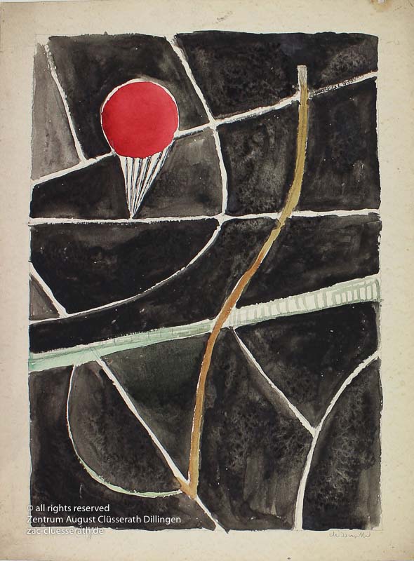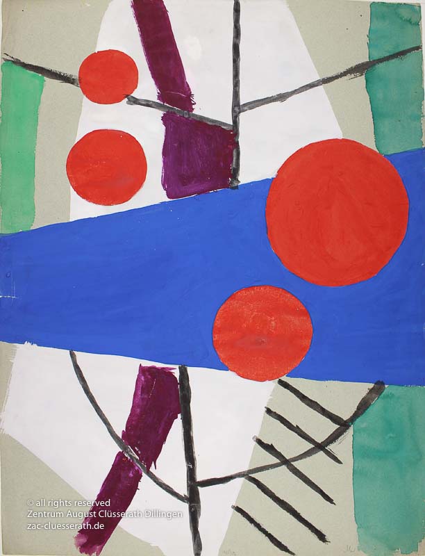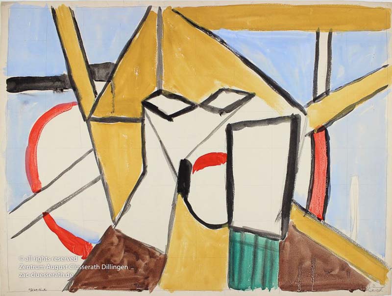 Das erste vollkommen abstrakte Gemälde entsteht 1951, jedoch pendelt August Clüsserath bis Mitte der 1950er Jahre zwischen Figuration und Abstraktion. Insbesondere Picasso und der Kubismus mit seinen verzerrten Perspektiven dienten Clüsserath als Inspirationsquelle. Er schöpft aus den Möglichkeiten, die sich ihm durch die Befreiung von Farbe und Form bieten. Immer mehr reduziert er dann die Figuration. Seine Landschaftsdarstellungen bestehen bald nur noch aus farbigen geometrischen Elementen.