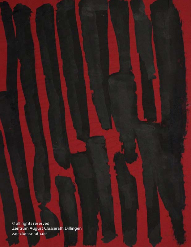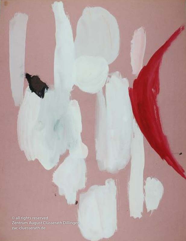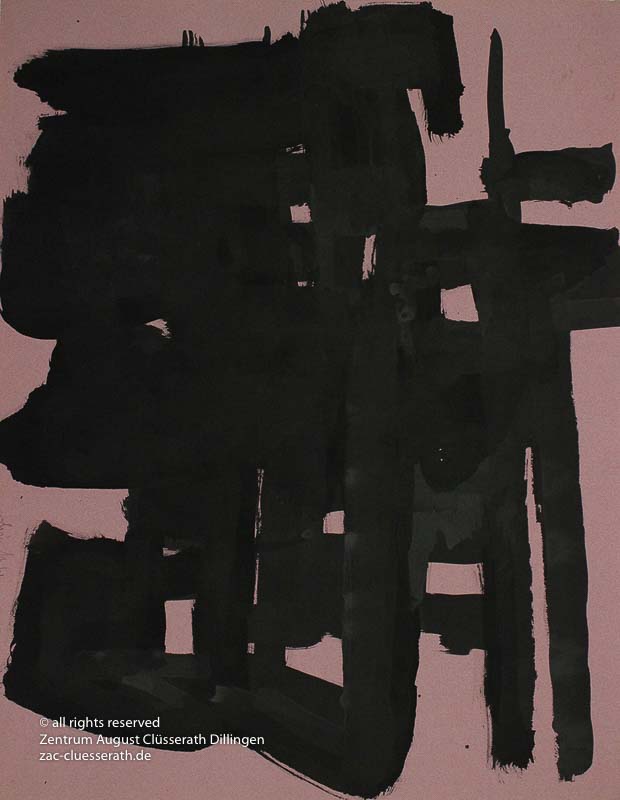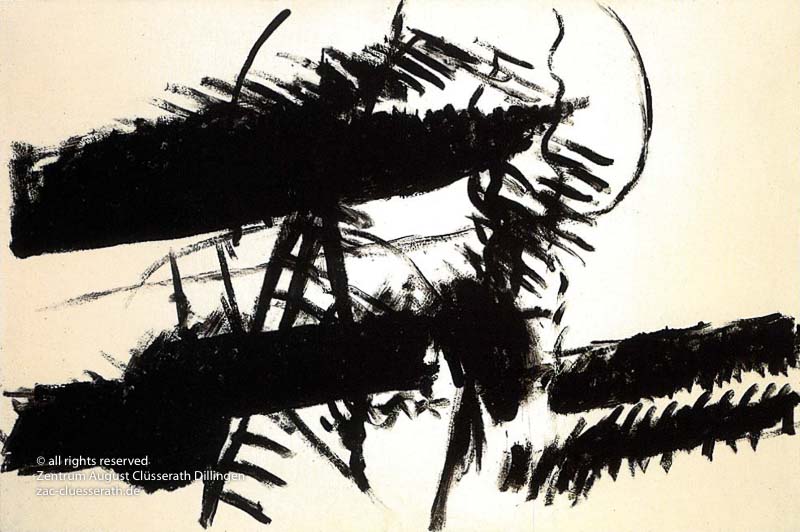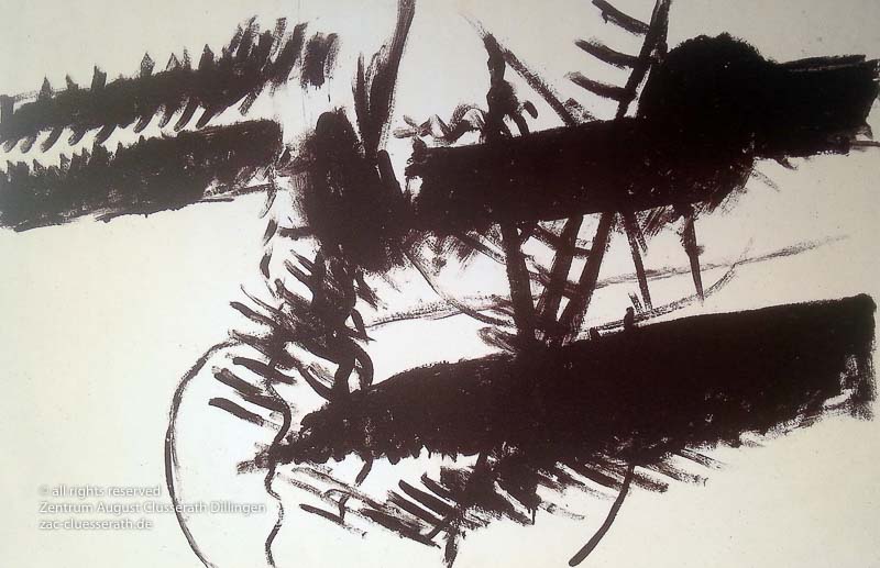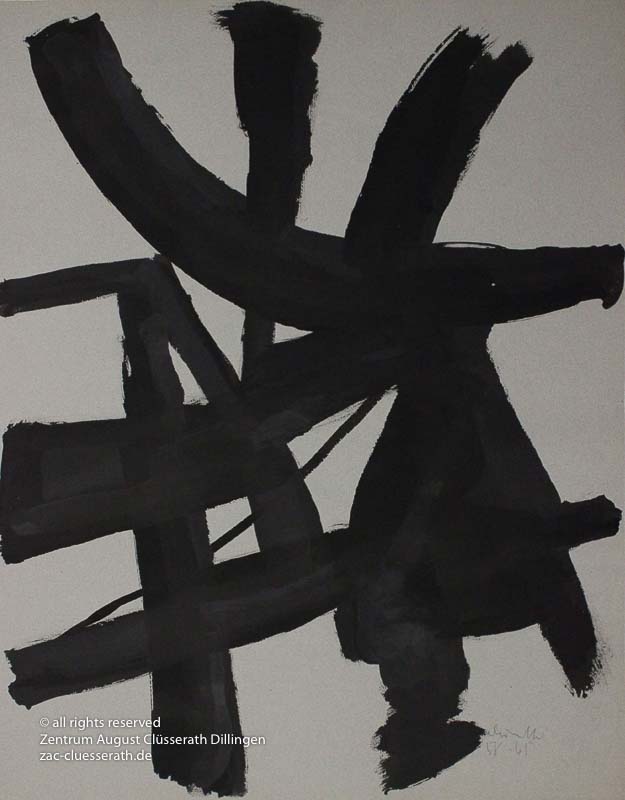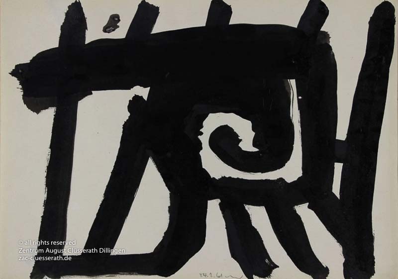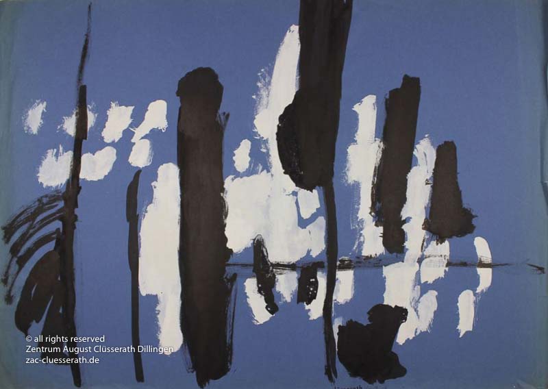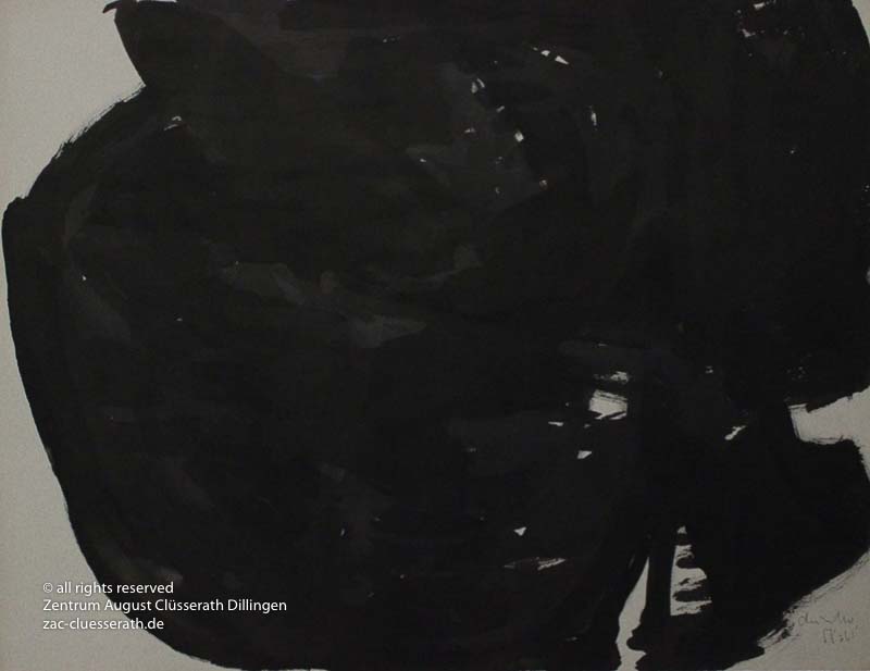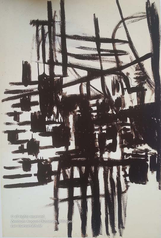 Ab Mitte der 1950er Jahre befreit sich August Clüsserath endgültig vom Gegenstand und schafft vollkommen abstrakte Kompositionen. Aus geometrischen Elementen werden bewegte Farbflecke. Clüsseraths Strich wird gestischer und leichter. Die sicherlich radikalsten Formulierungen sind die schwarz-weißen Lackbilder: gestische Arbeiten, bei denen sich die Linien locker auf dem Untergrund bewegen oder sich zu einer kompakten Fläche verdichten. Mit diesen Arbeiten schließt er auf zu den großen Protagonisten der abstrakt-ungegenständlichen Malerei jener Zeit, beispielsweise zu Franz Kline, Hans Hartung oder Pierre Soulages. Neben den schwarz-weißen Bildern entstehen eindrucksvolle Kompositionen, in denen Clüsserath die Farbe zur Geltung bringt, mit schnellem Pinselduktus gemalt und von schwarzen Linien und Strichen akzentuiert.