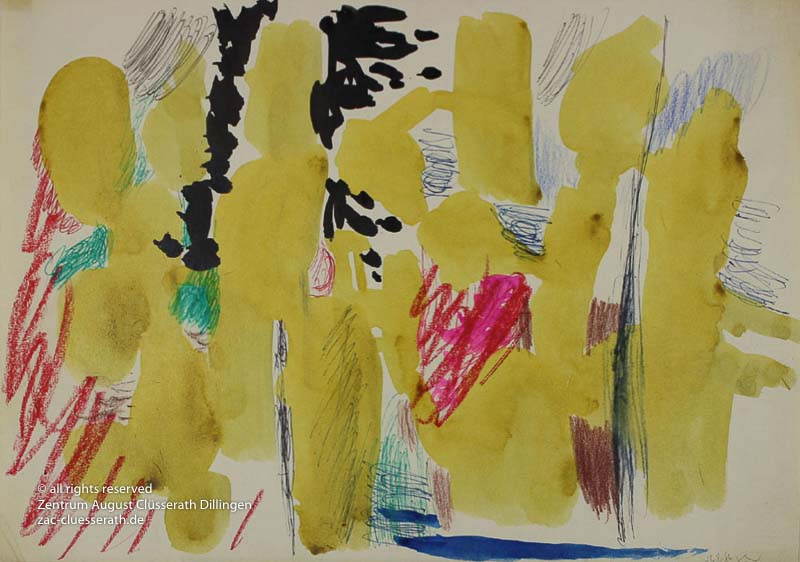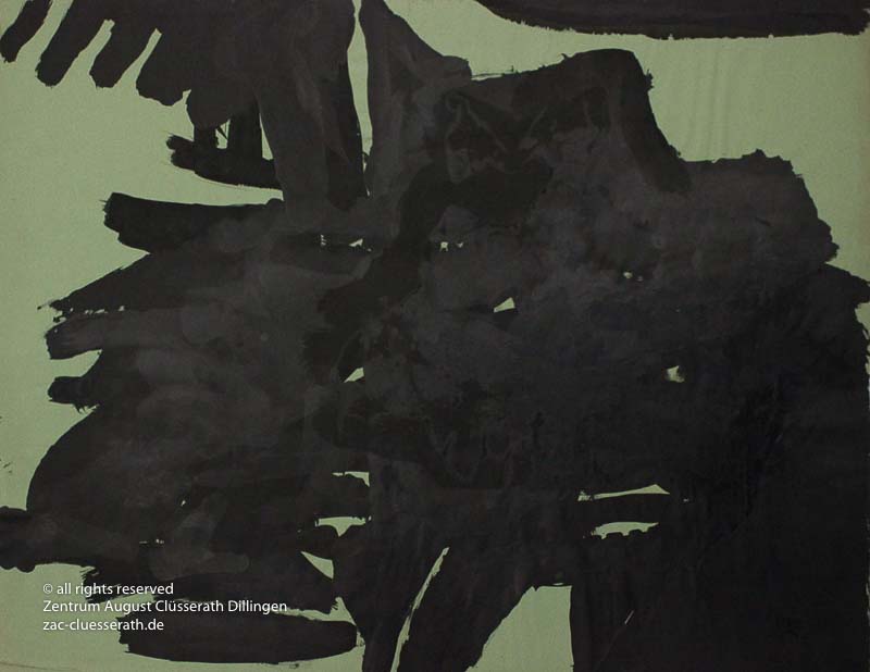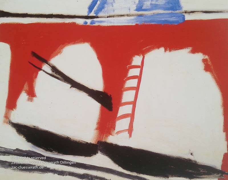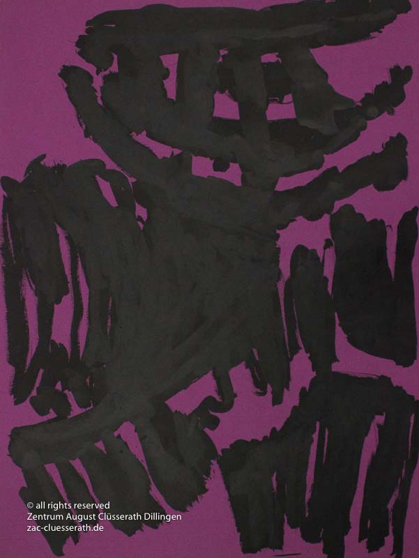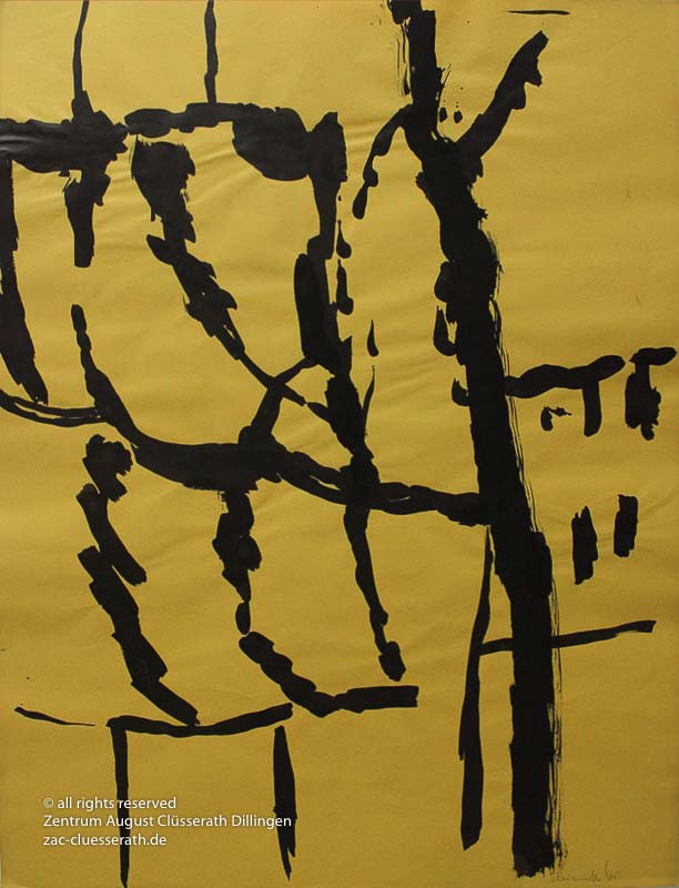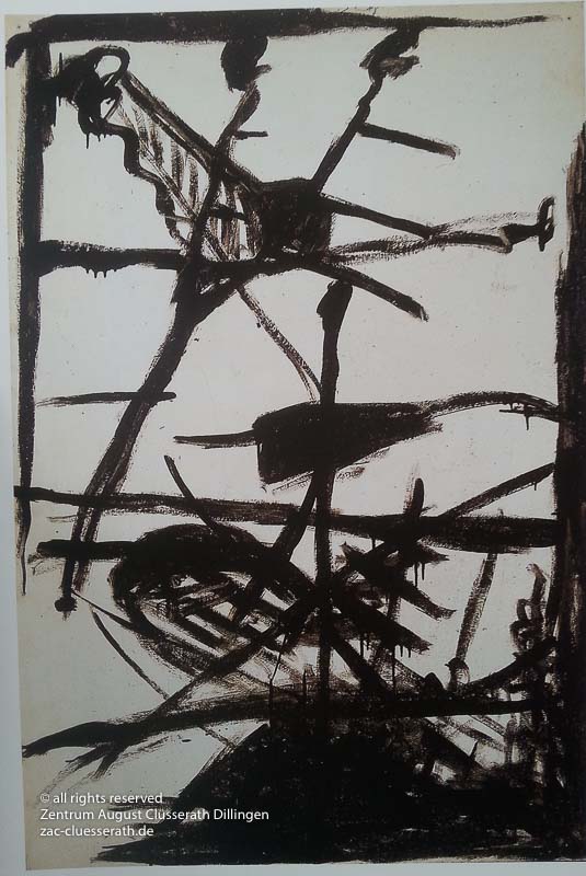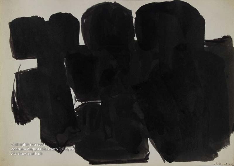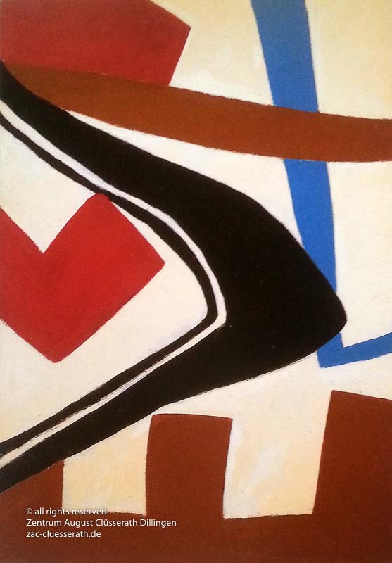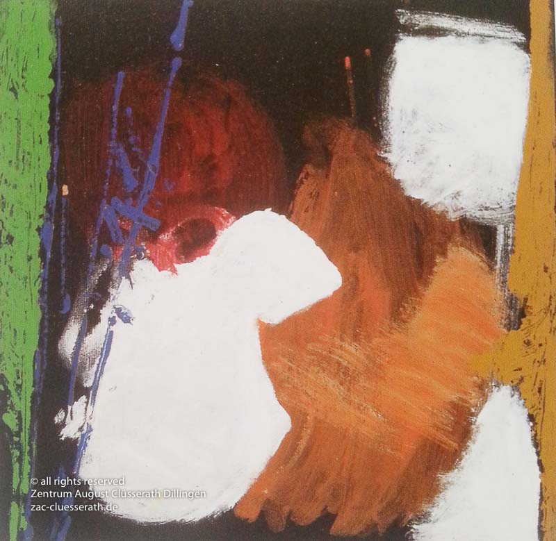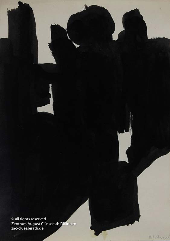 Ab Mitte der 1950er Jahre befreit sich August Clüsserath endgültig vom Gegenstand und schafft vollkommen abstrakte Kompositionen. Aus geometrischen Elementen werden bewegte Farbflecke. Clüsseraths Strich wird gestischer und leichter. Die sicherlich radikalsten Formulierungen sind die schwarz-weißen Lackbilder: gestische Arbeiten, bei denen sich die Linien locker auf dem Untergrund bewegen oder sich zu einer kompakten Fläche verdichten. Mit diesen Arbeiten schließt er auf zu den großen Protagonisten der abstrakt-ungegenständlichen Malerei jener Zeit, beispielsweise zu Franz Kline, Hans Hartung oder Pierre Soulages. Neben den schwarz-weißen Bildern entstehen eindrucksvolle Kompositionen, in denen Clüsserath die Farbe zur Geltung bringt, mit schnellem Pinselduktus gemalt und von schwarzen Linien und Strichen akzentuiert.