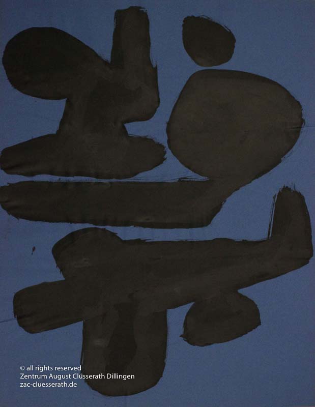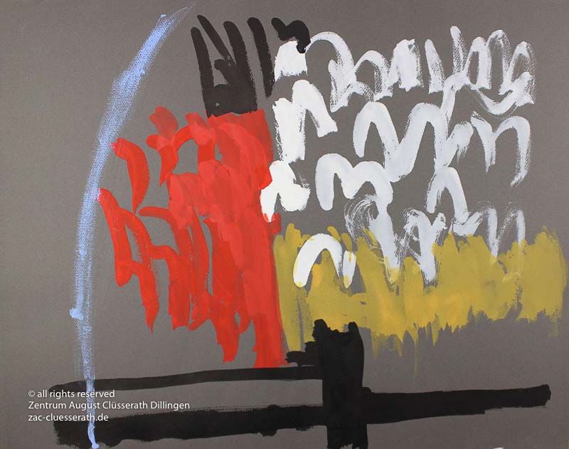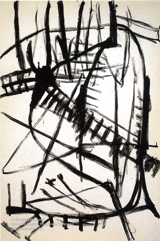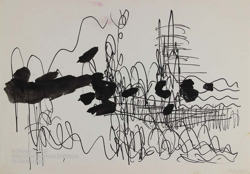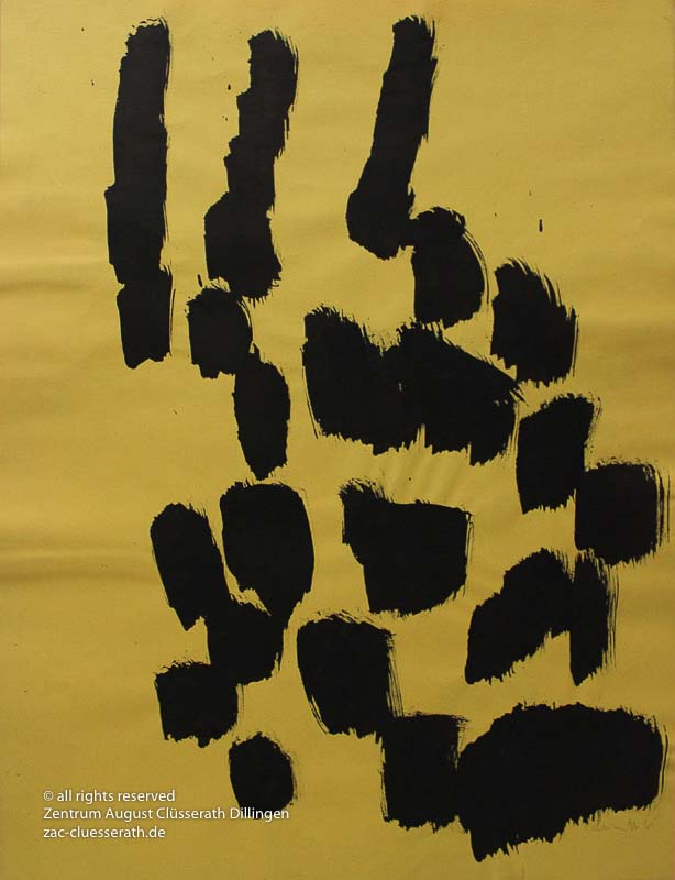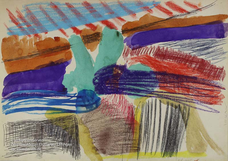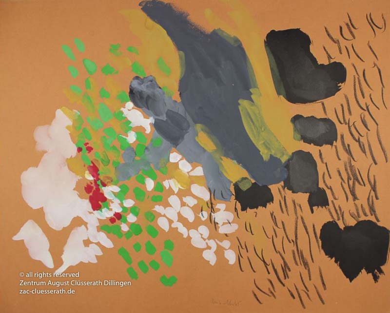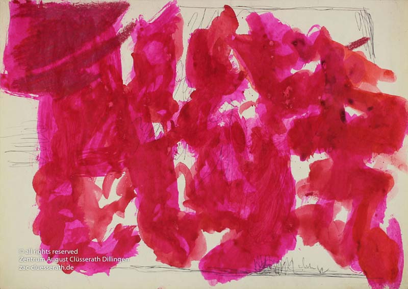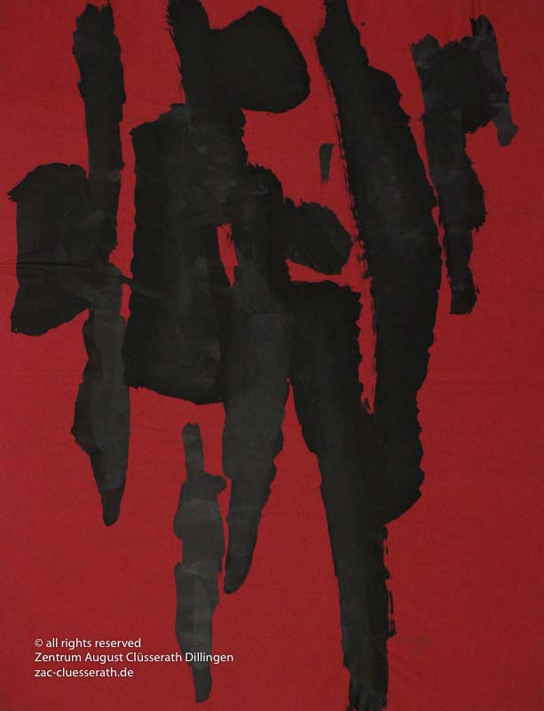 Ab Mitte der 1950er Jahre befreit sich August Clüsserath endgültig vom Gegenstand und schafft vollkommen abstrakte Kompositionen. Aus geometrischen Elementen werden bewegte Farbflecke. Clüsseraths Strich wird gestischer und leichter. Die sicherlich radikalsten Formulierungen sind die schwarz-weißen Lackbilder: gestische Arbeiten, bei denen sich die Linien locker auf dem Untergrund bewegen oder sich zu einer kompakten Fläche verdichten. Mit diesen Arbeiten schließt er auf zu den großen Protagonisten der abstrakt-ungegenständlichen Malerei jener Zeit, beispielsweise zu Franz Kline, Hans Hartung oder Pierre Soulages. Neben den schwarz-weißen Bildern entstehen eindrucksvolle Kompositionen, in denen Clüsserath die Farbe zur Geltung bringt, mit schnellem Pinselduktus gemalt und von schwarzen Linien und Strichen akzentuiert.